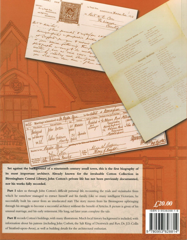 John Cotton was a 19th century architect, known for numerous buildings in Birmingham and the surrounding area. His private papers, known as the Cotton Collection, is housed at the Library of Birmingham. Published in 2002, this biography covers both his personal life and his buildings, with many illustrations.